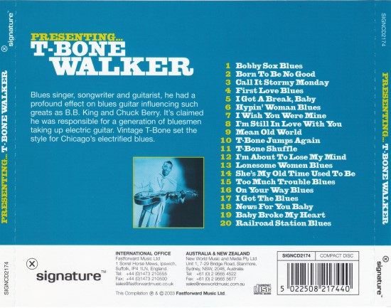 Исполнитель: T-Bone Walker Альбом: Presenting... T-Bone Walker Год выпуска: 2003 Стиль: Blues Формат: *.flac (tracks, log, cue, covers) Битрейт: Lossless Время звучания: 0:56:07 Размер файла: 329mb ___________________________ Tracklist: -------------------------------------- 01. Bobby Sox Blues 02. Born To Be No Good 03. Call It Stormy Monday 04. First Love Blues 05. I Got A Break, Baby 06. Hypin' Woman Blues 07. I Wish You Were Mine 08. I'm Still In Love With You 09. Mean Old World 10. T-Bone Jumps Again 11. T-Bone Shuffle 12. I'm About To Lose My Mind 13. Lonesome Women Blues 14. She's My Old Time Used To Be 15. Too Much Trouble Blues 16. On Your Way Blues 17. I Got The Blues 18. News For You Baby 19. Baby Broke My Heart 20. Railroad Station Blues